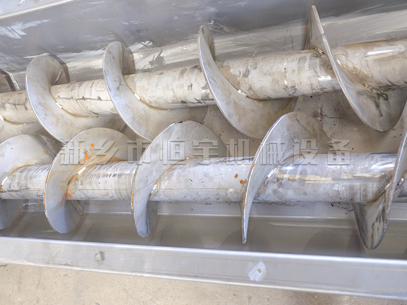 雙軸螺旋輸送機的工作原理是旋轉(zhuǎn)的螺旋葉片將物料在槽或管中推移而得到輸送物料的目的,散料在自重和機殼的摩擦力作用下堆積在槽的下部,不隨葉片旋轉(zhuǎn)而被葉片推動前進。螺旋輸送機旋轉(zhuǎn)軸上焊的螺旋葉片,葉片的面型根據(jù)輸送物料的不同有實體面型、帶式面型、葉片面型等型式。螺旋輸送機的螺旋軸在物料運動方向的終端有止推軸承以隨物料給螺旋的軸向反力,在機長較長時,應加中間吊掛軸承。