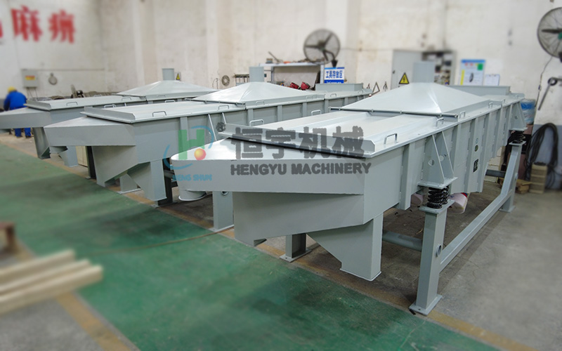 大型直線振動(dòng)篩由篩箱由槽體、上蓋、進(jìn)料口、篩框、篩板(網(wǎng))、襯網(wǎng)、出料口等組成。減振系統(tǒng)由阻尼彈簧和彈簧座等組成。用優(yōu)質(zhì)振動(dòng)電機(jī)做為振動(dòng)源,本篩機(jī)配有兩臺(tái)振動(dòng)電機(jī),工作時(shí)兩臺(tái)電機(jī)偏心塊做相反方向轉(zhuǎn)動(dòng),水平方向兩臺(tái)電機(jī)合力為零,垂直于電機(jī)軸方向形成一合力,電機(jī)軸與篩板成一定夾角,合力使物料在篩網(wǎng)上被拋起,同時(shí)向前做運(yùn)動(dòng)。物料從經(jīng)給料機(jī)均勻地進(jìn)入篩機(jī)的進(jìn)料口,通過多層不同孔徑篩網(wǎng)產(chǎn)生數(shù)種產(chǎn)品和不合格的篩上物、篩下物分別從各自的出口排出。
